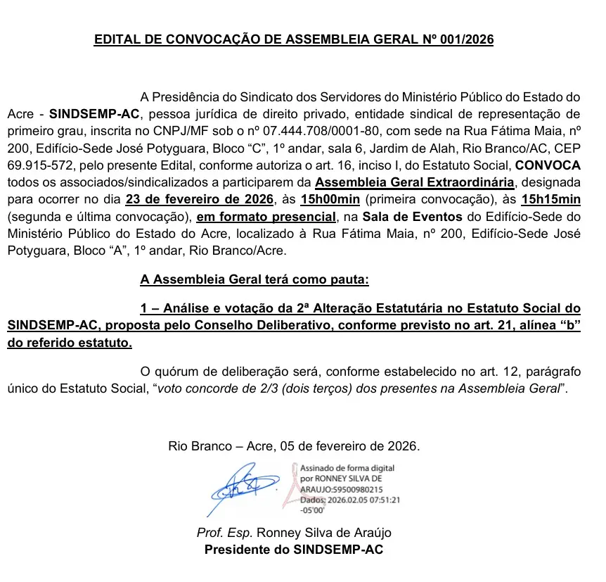 SINDSEMP-AC convoca Assembleia Geral Extraordinária para votação de alteração estatutária em 23 de fevereiro 11/02/2026 9:11