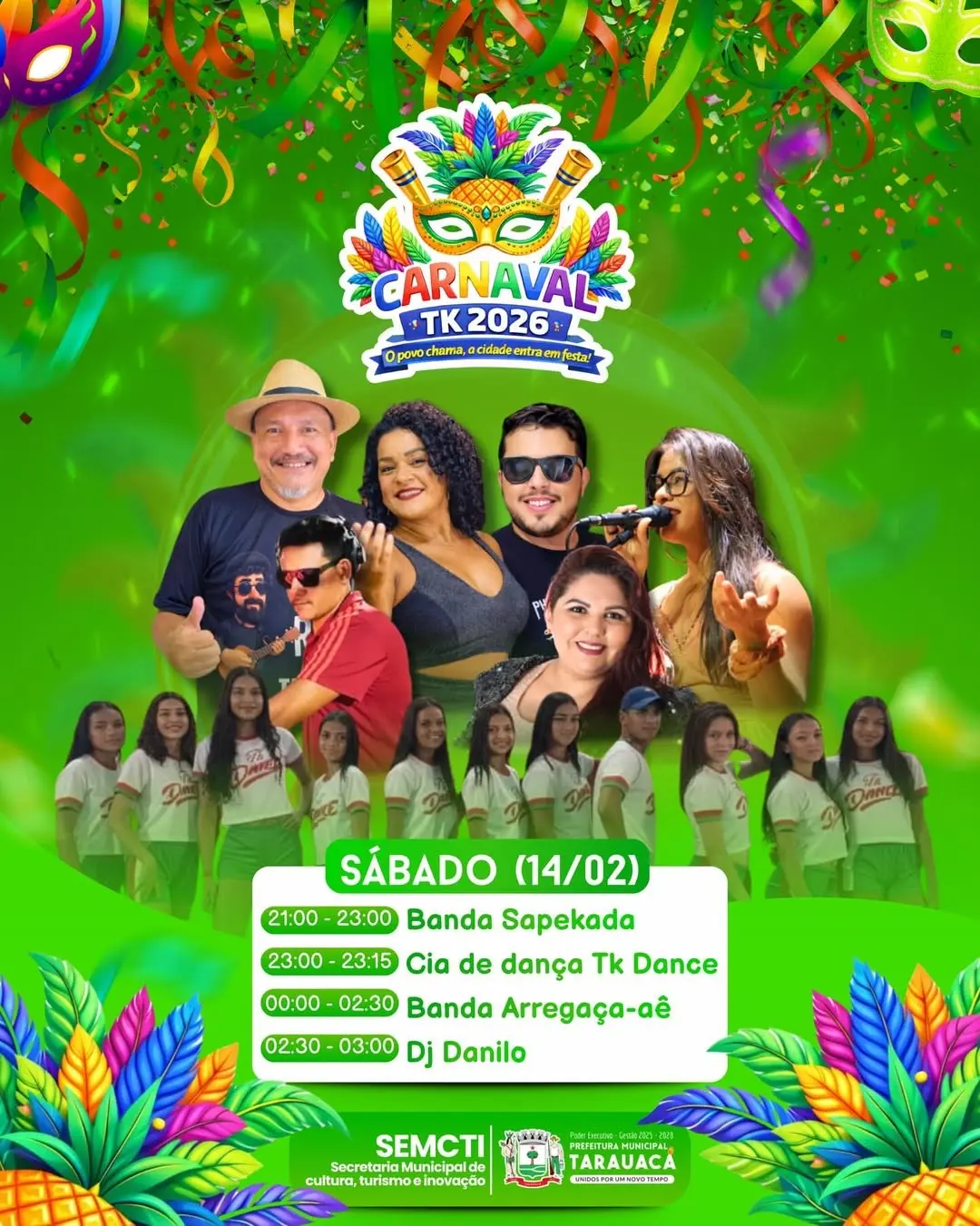 O Carnaval TK 2026 será realizado de 14 a 17 de fevereiro, na Praça Municipal Alton Furtado, em Tarauacá, com quatro noites de programação que incluem shows musicais, apresentações de dança, bailes infantis e DJs.