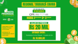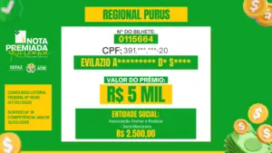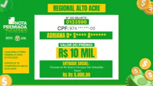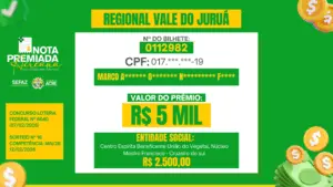 Ao todo, foram contemplados três ganhadores mensais em cada uma das cinco regionais do estado (Alto Acre, Baixo Acre, Juruá, Purus e Tarauacá-Envira), com prêmios nos valores de R$ 5 mil, R$ 10 mil e R$ 20 mil, gerados a partir de notas fiscais emitidas no mês de janeiro deste ano.