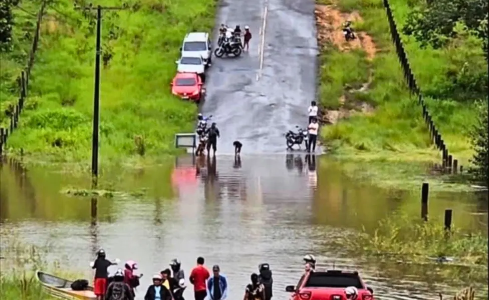 A rodovia AC-407, que dá acesso a Rodrigues Alves, no interior do Acre, segue alagada na tarde desta quinta-feira, 12, em um ponto próximo ao município, devido às fortes chuvas e à barragem irregular de um açude particular.
