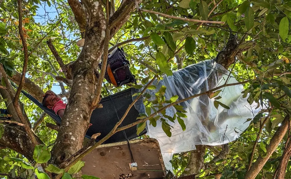 Edir decidiu então montar uma espécie de abrigo improvisado na árvore, onde pendurou alguns pertences como balde, uma rede e mochila.