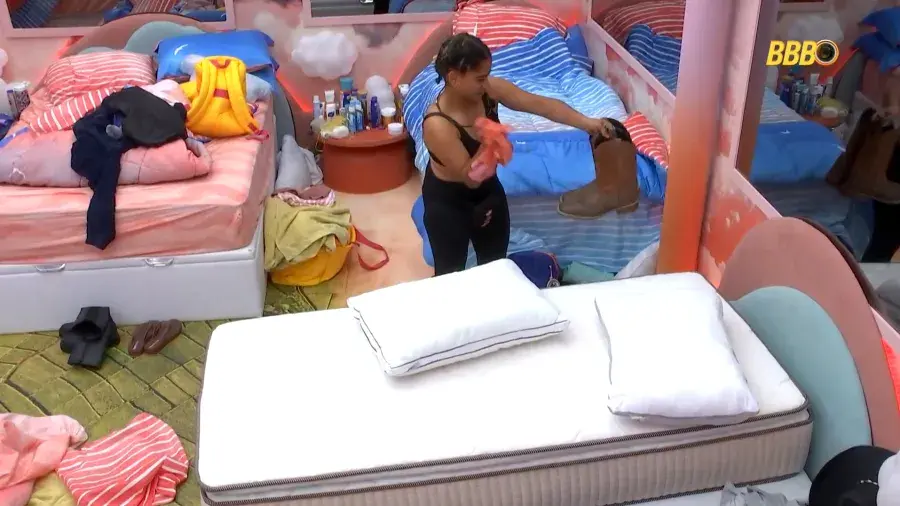 Antes de entrar no banho, ela foi até o quarto de Cowboy e desarrumou a cama do brother. Enquanto desfazia a cama e sujava os itens dele, disse: “Você acha que está mexendo com quem? Olha, a meia branquinha. Idiota”.
