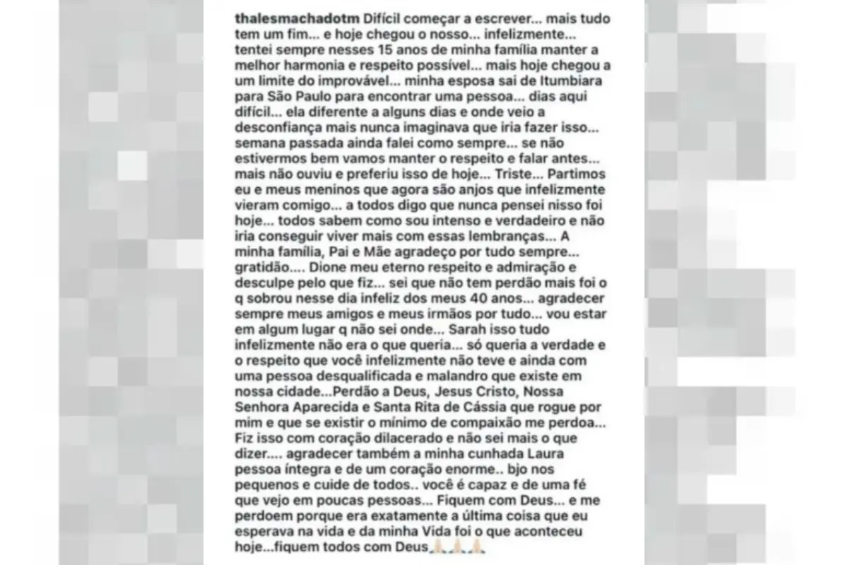 Thales Machado publicou carta de despedida em rede social. No texto, ele pede desculpas a familiares e amigos, afirma enfrentar dificuldades no casamento e relata ter descoberto suposta traição da esposa.