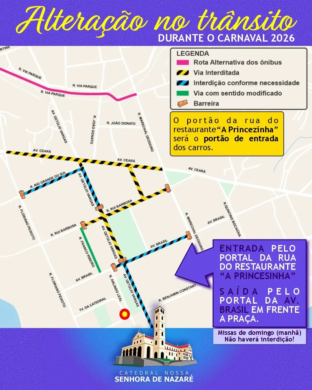 A Catedral Nossa Senhora de Nazaré, em Rio Branco, informou que haverá mudanças no acesso de veículos durante o período do Carnaval 2026, devido às alterações no trânsito nas imediações da Praça da Revolução. A medida vale para as missas realizadas no período da noite.