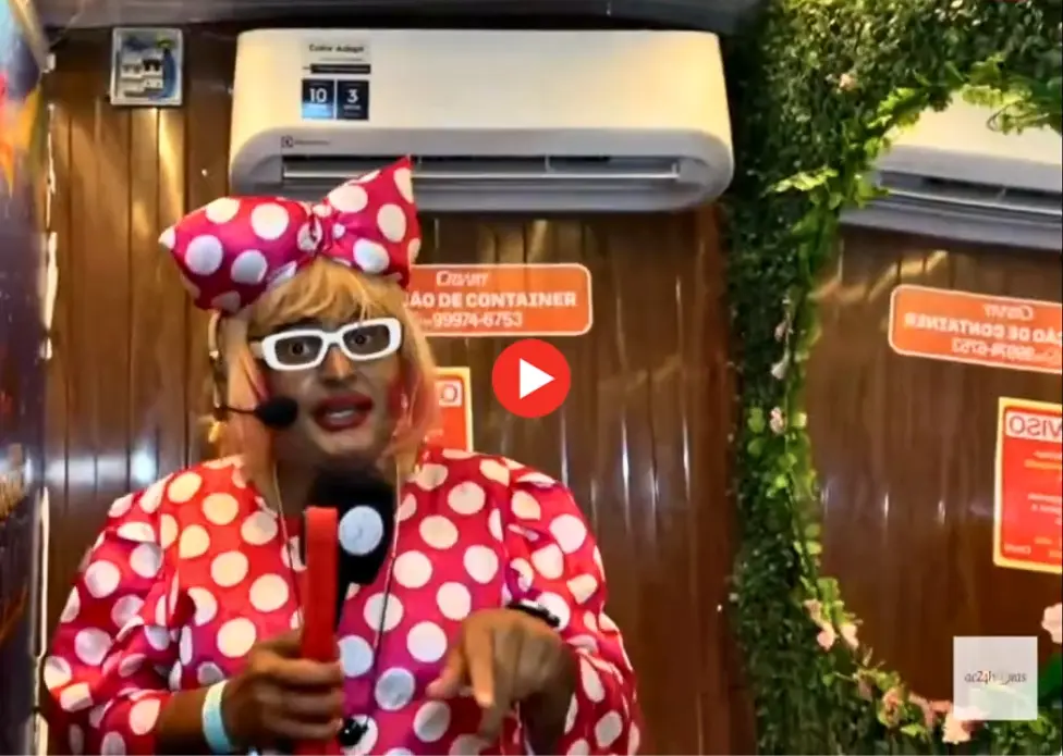 “Nós vamos mostrar aqui o banheiro pra vocês verem como é que é a qualidade, tá?*”, afirmou a Gorete é Show antes de entrar em um dos contêineres instalados na área da festa.