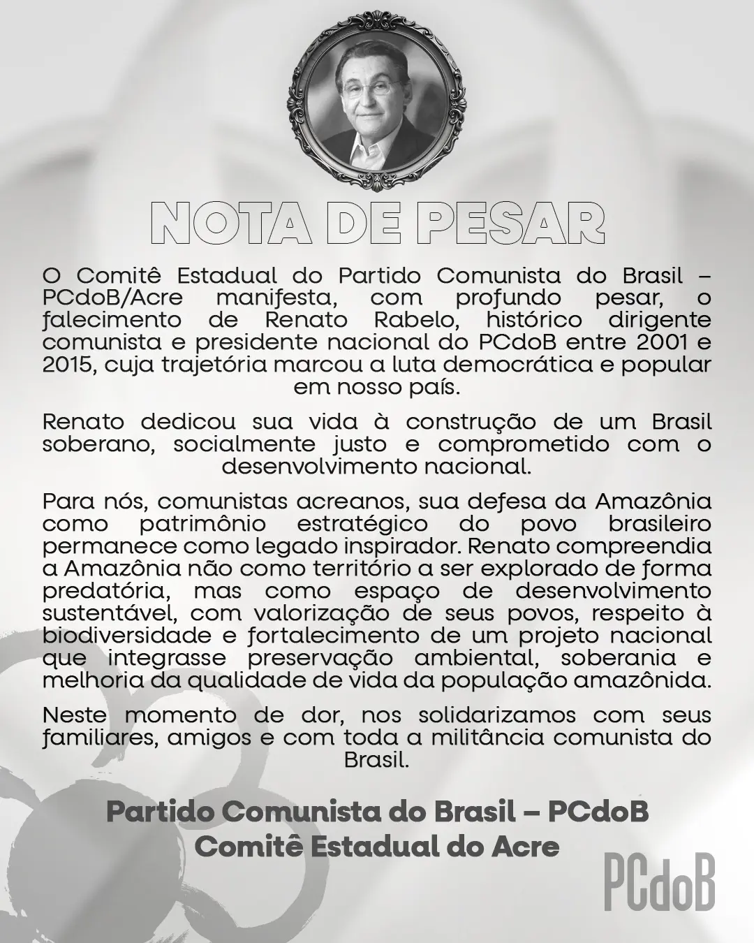 “O Comitê Estadual do Partido Comunista do Brasil – PCdoB/Acre manifesta, com profundo pesar, o falecimento de Renato Rabelo”, diz o texto, que também destaca que a defesa da Amazônia feita por ele permanece como legado para os militantes do partido.