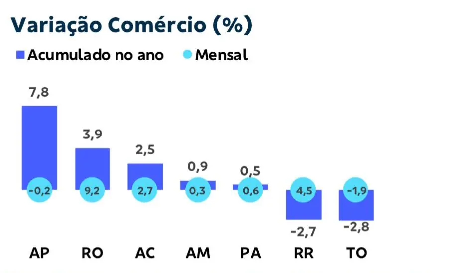 De acordo com o levantamento, o crescimento do comércio acreano no acumulado do ano foi de 3,9%, resultado considerado intermediário dentro do cenário regional. O estudo mostra que Amazonas e Pará também tiveram evolução mais moderada, enquanto Roraima e Tocantins encerraram o período com retração, refletindo maior fragilidade na demanda interna.
