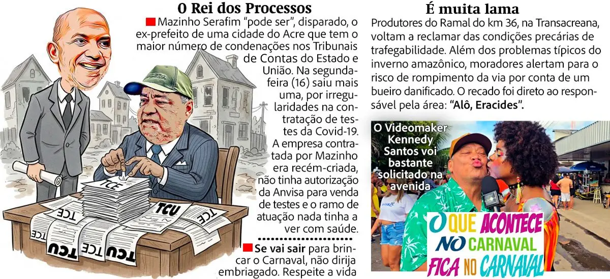 E por falar em festa, alguém sabe informar por onde anda Gladson? Estaria recluso, viajando ou na casa de Papai, em Manaus? O certo é que neste carnaval, com a sua ausência na pista, o prefeito Bocalom deita e rola para os holofotes de uma mídia que precisa de notícias.