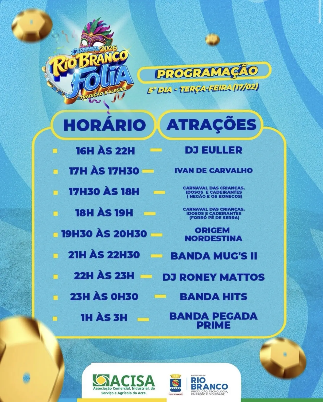 A programação do último dia do Carnaval Folia, Tradição e Alegria 2026 terá continuidade nesta terça-feira (17), em Rio Branco, com o desfile do Concurso de Blocos Carnavalescos e uma série de atrações musicais ao longo da tarde e da noite. A nova data foi definida após o temporal registrado na segunda-feira (16), que permitiu apenas a apresentação do bloco Unidos do Fuxico antes da intensificação da chuva.
