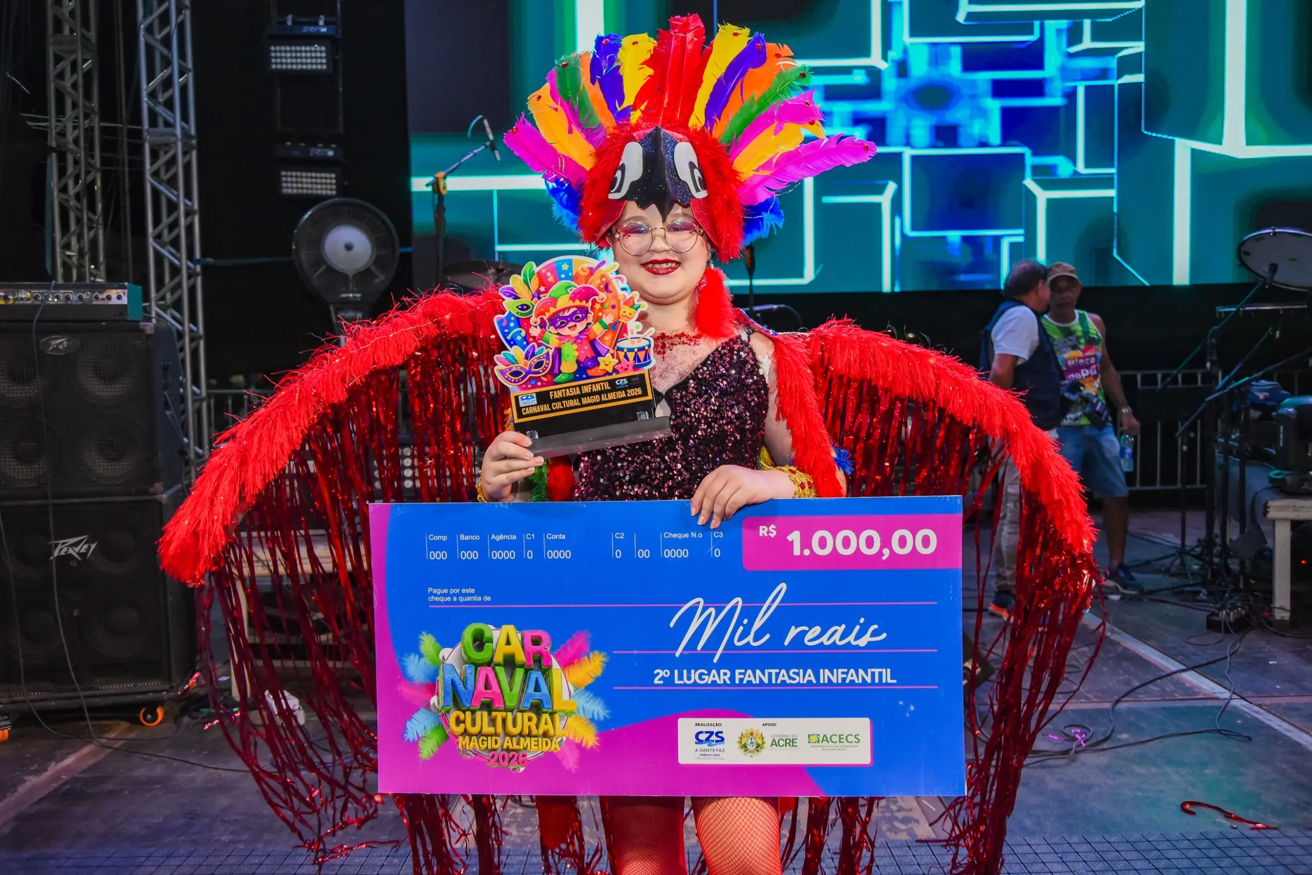O segundo lugar ficou com Íris Emanuele Correia, que encantou com uma fantasia de arara vermelha, produzida em semanas de preparação. “Foram semanas e semanas fazendo esse trabalho. A gente pegou várias inspirações. Eu amei participar, estava super esperando”, contou.