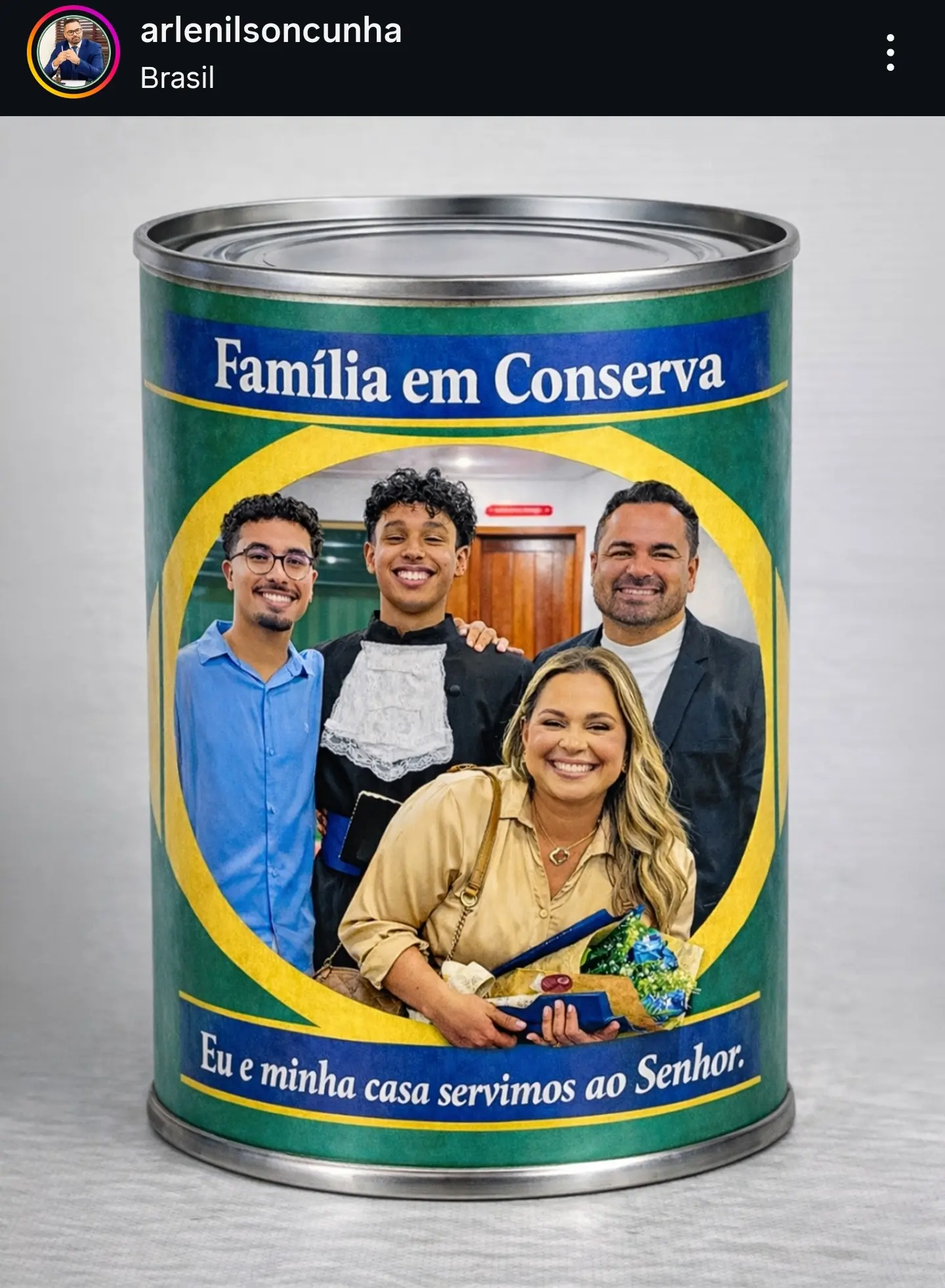 Outro político acreano que também participou da trend foi o deputado estadual Arlenilson Cunha (PL), que compartilhou uma montagem semelhante com uma foto de sua família e usou a publicação para reforçar um discurso de valores conservadores e religiosos.