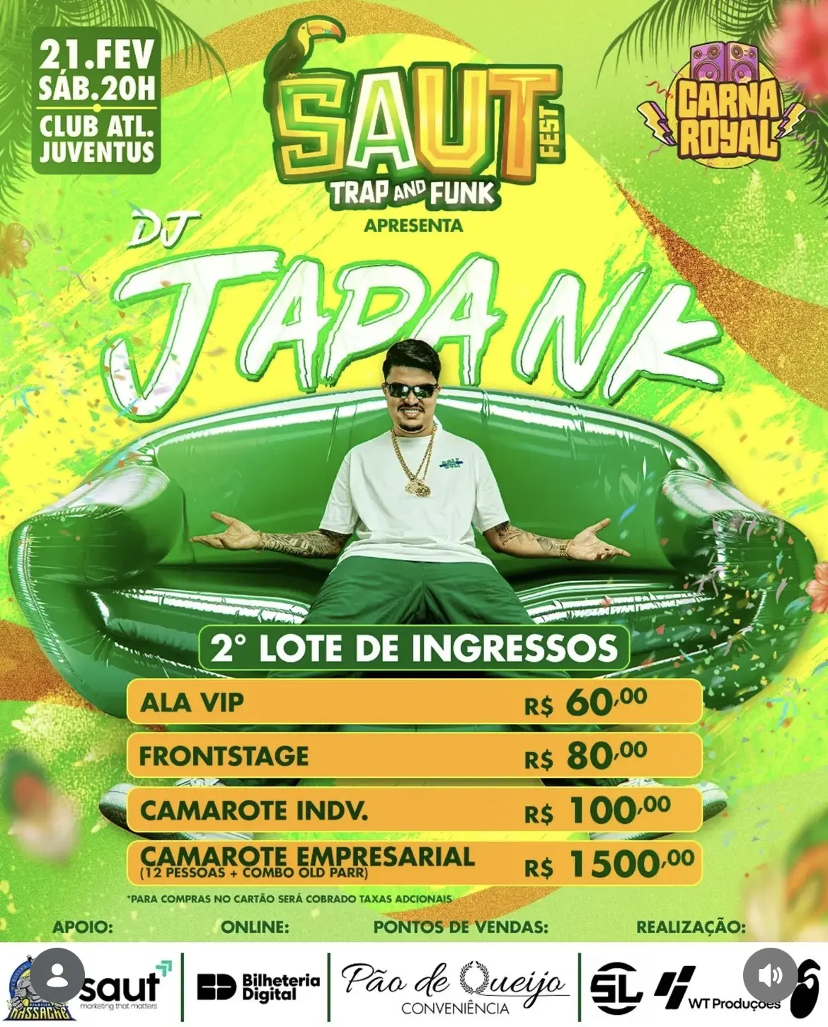Os ingressos podem ser adquiridos online pela Bilheteria Digital. Informações também nos perfis @carnaroyal.ac e @sautclub.