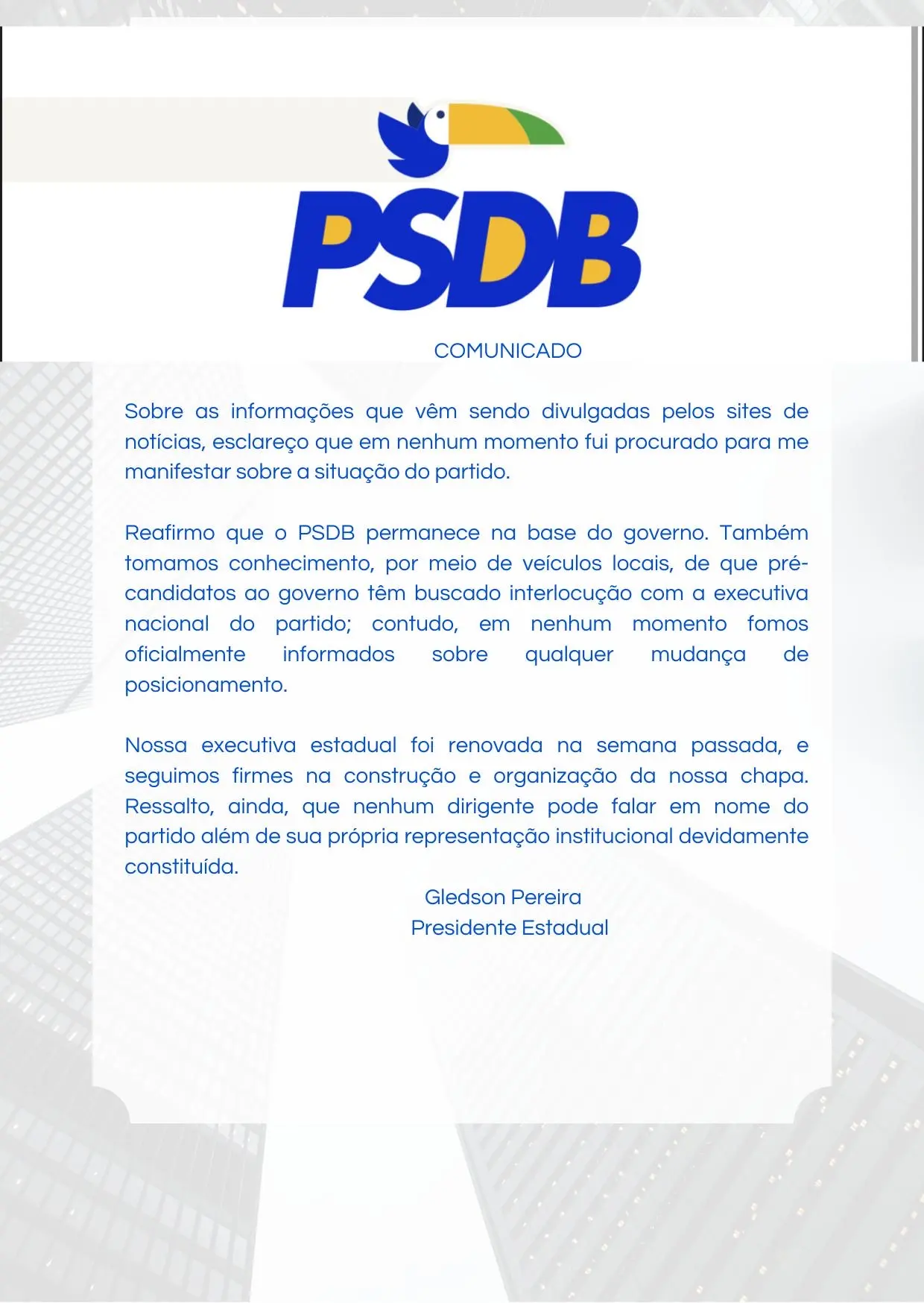 “Sobre as informações que vêm sendo divulgadas pelos sites de notícias, esclareço que em nenhum momento fui procurado para me manifestar sobre a situação do partido. Reafirmo que o PSDB permanece na base do governo. Também tomamos conhecimento, por meio de veículos locais, de que pré-candidatos ao governo têm buscado interlocução com a executiva nacional do partido; contudo, em nenhum momento fomos oficialmente informados sobre qualquer mudança de posicionamento”, diz a nota.