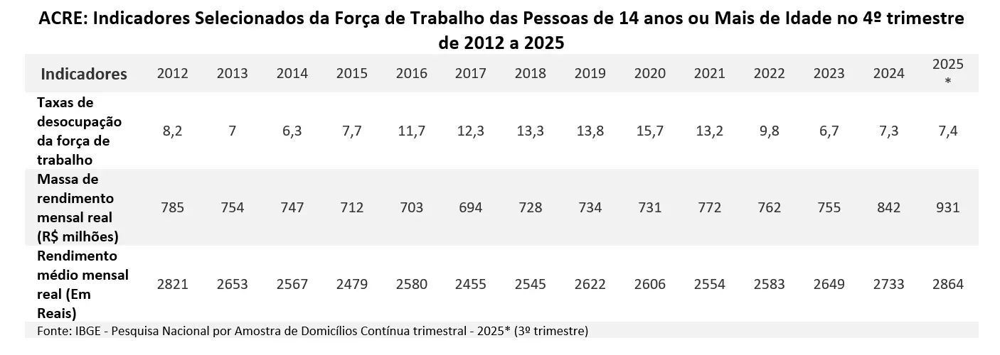 Portanto, embora a massa salarial seja um indicador central para avaliar o dinamismo do mercado de trabalho e o poder de compra das famílias, ela deve ser analisada em conjunto com outras fontes de renda e com o contexto econômico mais amplo. Somente essa visão integrada permite compreender de forma completa a capacidade de geração de riqueza, a distribuição da renda e o grau de sustentabilidade do crescimento econômico. Na tabela a seguir, constam alguns indicadores selecionados da força de trabalho acreana nos últimos 14 anos.
