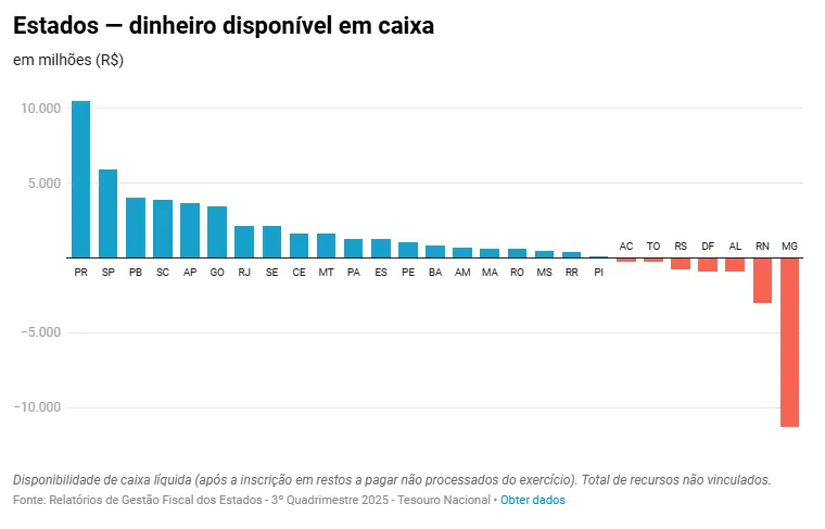 Já no Distrito Federal, a disponibilidade financeira ficou negativa em R$ 876,6 milhões. O governador Ibaneis Rocha (MDB) avalia a possibilidade de aportes no Banco de Brasília (BRB) para equilibrar o orçamento, medida que pode ampliar a pressão fiscal. Em Alagoas, o resultado negativo está ligado à reestruturação de dívida com o Banco Mundial. Rio Grande do Sul e Tocantins registram cenário semelhante, mas, segundo os relatórios, sem impactos imediatos sobre serviços essenciais.