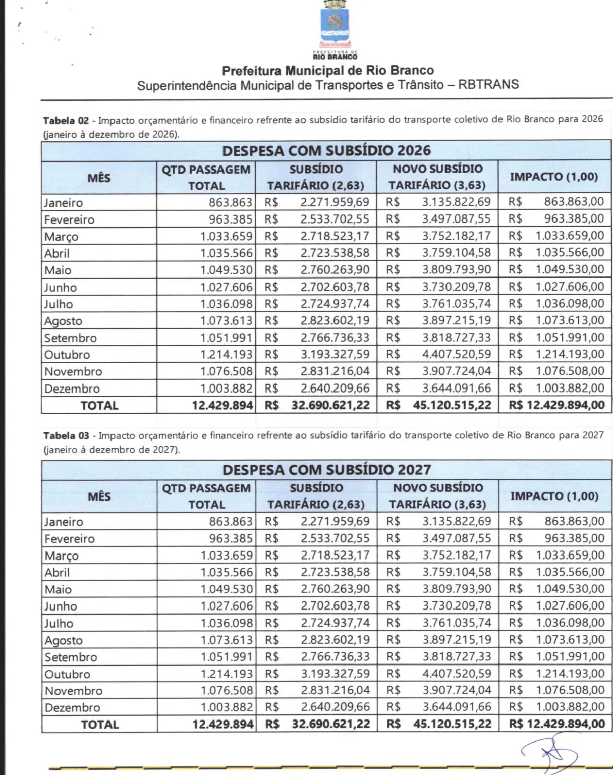 O atual modelo de subsídio ao sistema foi aprovado em setembro do ano passado pela Câmara Municipal de Rio Branco, quando os vereadores autorizaram, por 14 votos a 5, um aumento de 38% no repasse público ao transporte coletivo. À época, o projeto estimou impacto financeiro de R$ 7,4 milhões entre junho e dezembro de 2025.