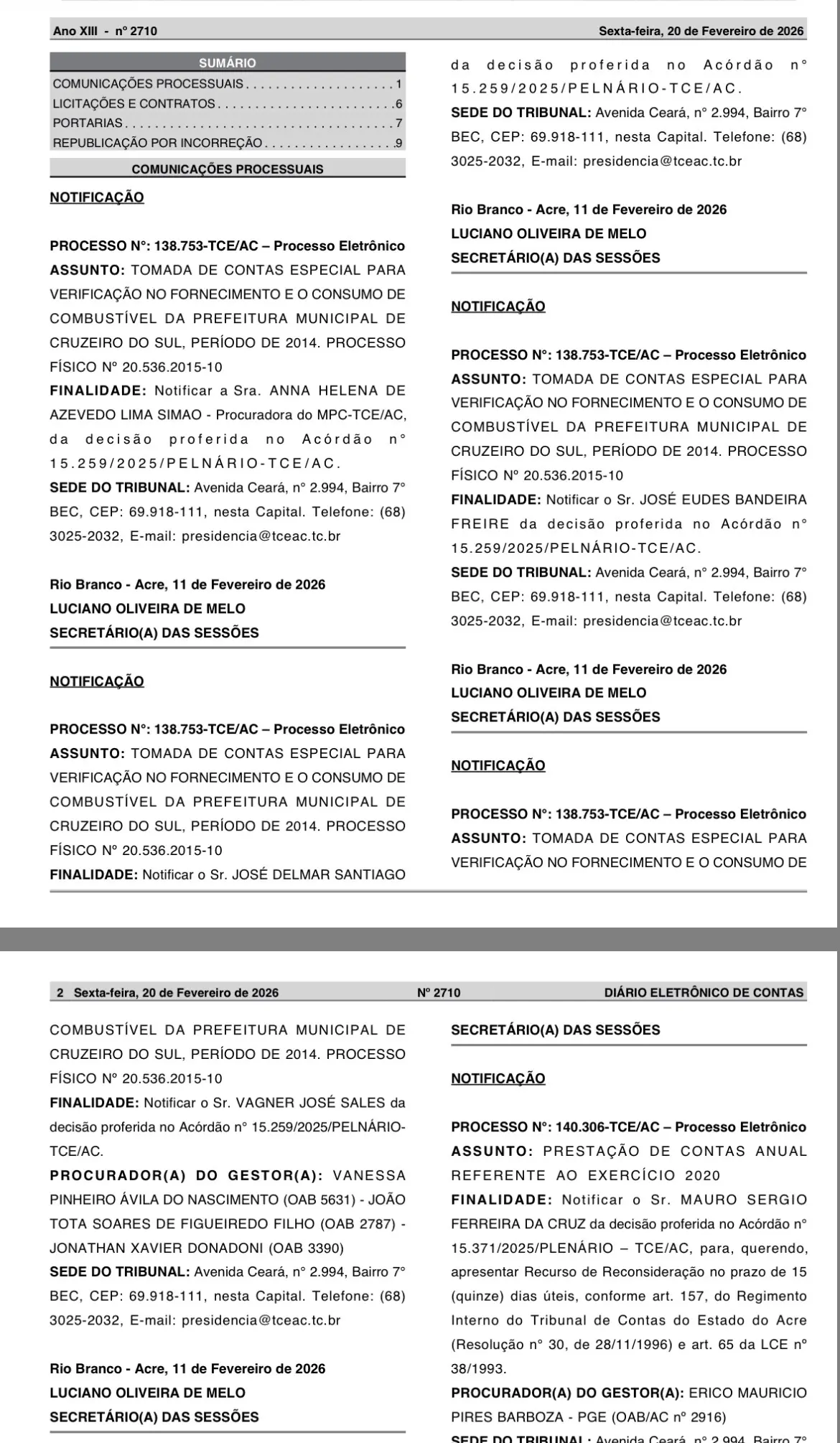 O Tribunal de Contas do Estado do Acre (TCE-AC) publicou, no Diário Eletrônico desta sexta-feira, 20, notificações relacionadas ao processo nº 138.753, que trata da tomada de contas especial destinada a apurar o fornecimento e o consumo de combustível pela Prefeitura de Cruzeiro do Sul no exercício de 2014.