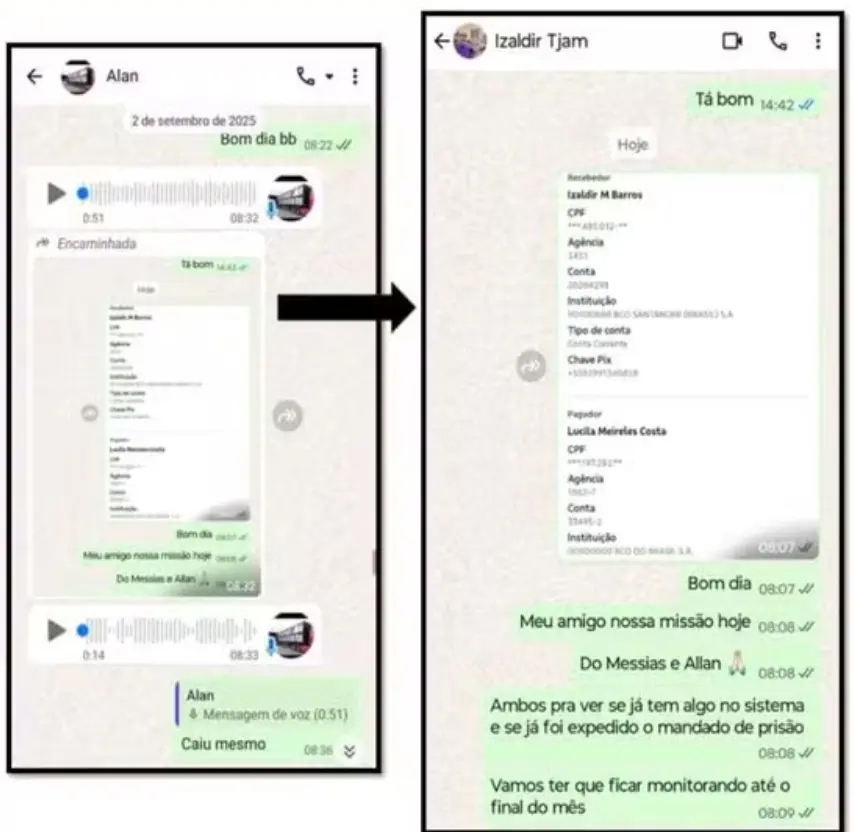Durante a investigação, foram apreendidos prints de conversas que indicam a troca de informações sobre pagamentos e decisões judiciais. De acordo com a polícia, mensagens mostram a suspeita Lucila Meireles Costa enviando comprovantes de pagamento a um servidor do tribunal e acompanhando a expedição de mandados de prisão.