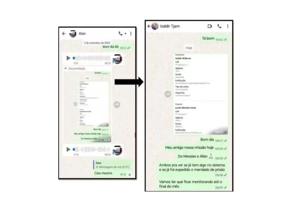Durante a investigação, foram apreendidos prints de conversas que indicam a troca de informações sobre pagamentos e decisões judiciais. De acordo com a polícia, mensagens mostram a suspeita Lucila Meireles Costa enviando comprovantes de pagamento a um servidor do tribunal e acompanhando a expedição de mandados de prisão.