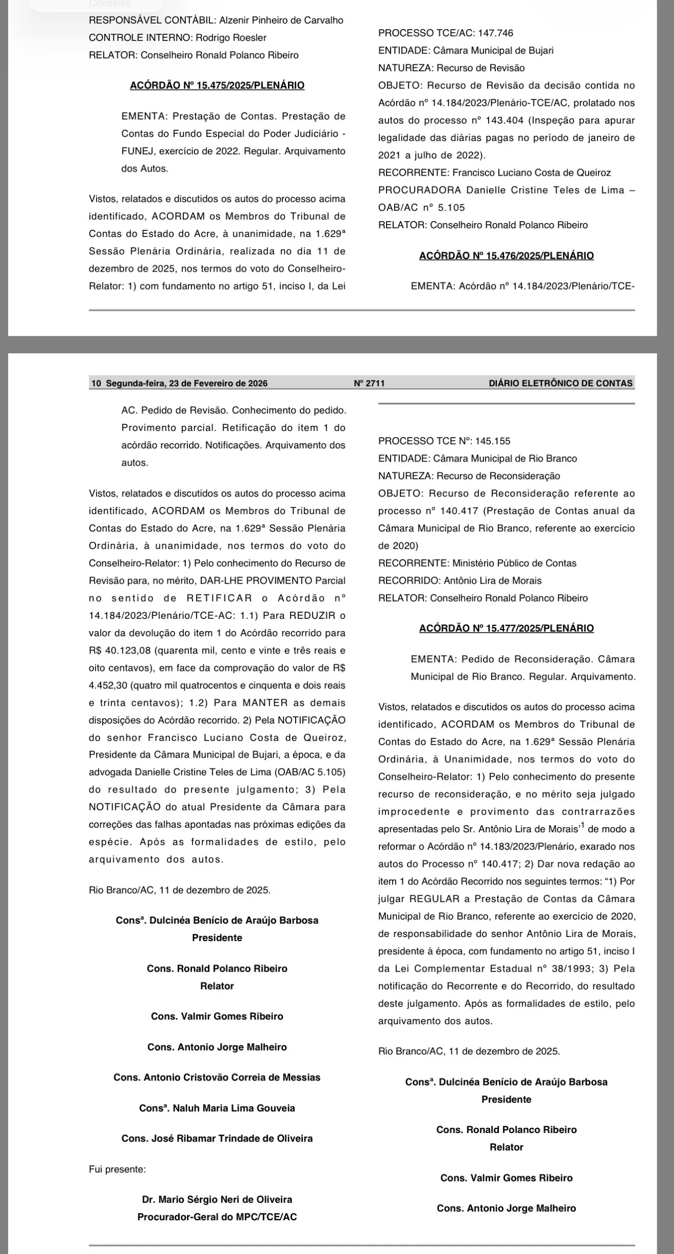 O processo teve como relator o conselheiro Ronald Polanco Ribeiro. A Corte também determinou a notificação do ex-presidente da Câmara e de sua representante legal, a advogada Danielle Cristine Teles de Lima (OAB/AC nº 5.105), sobre o resultado do julgamento.