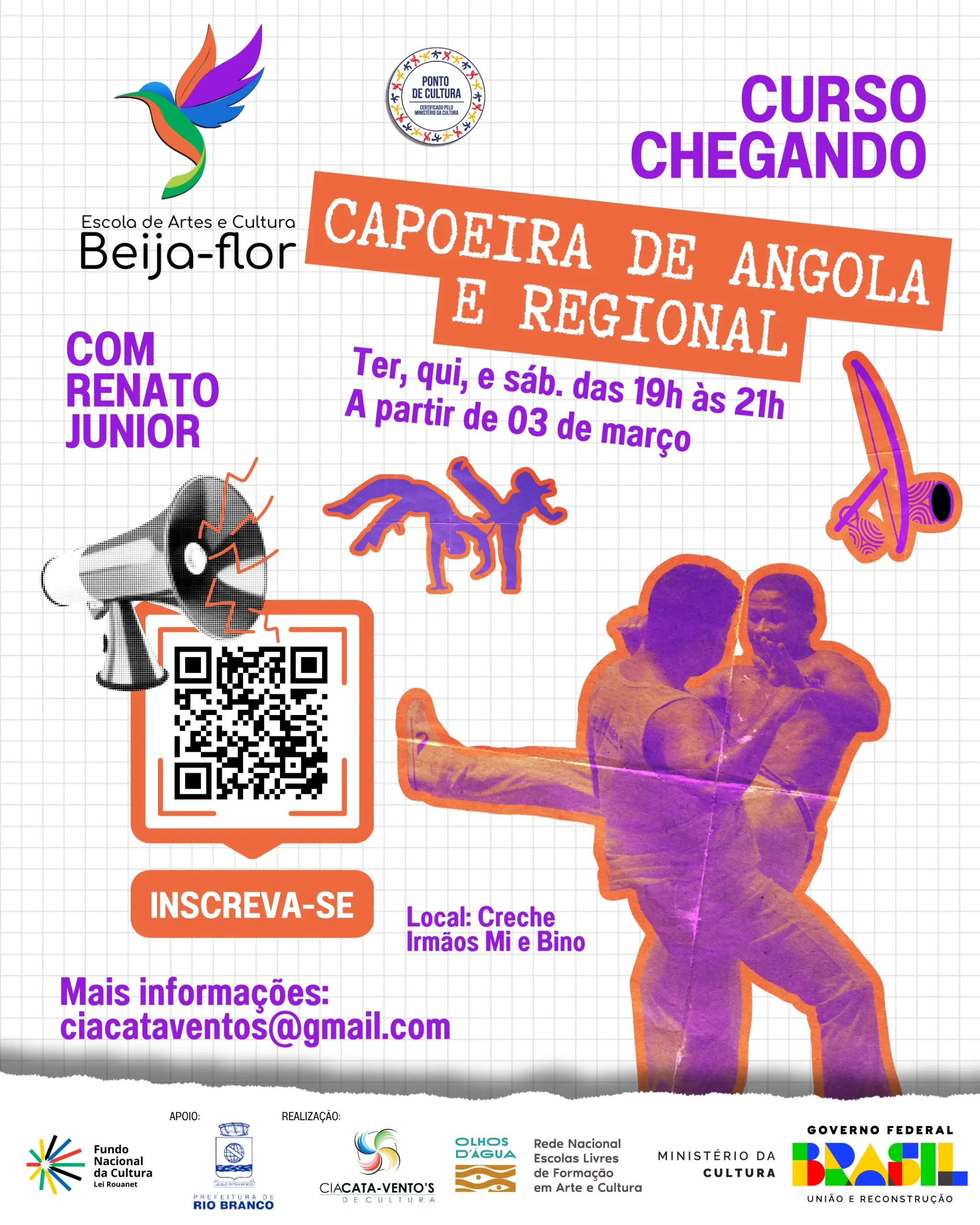 Entre as opções está o Curso de Capoeira de Angola e Regional, ministrado pelo professor Renato Junior, com aulas na Creche Irmãos Mi e Bino, às terças, quintas e sábados, das 19h às 21h, com início em 3 de março.