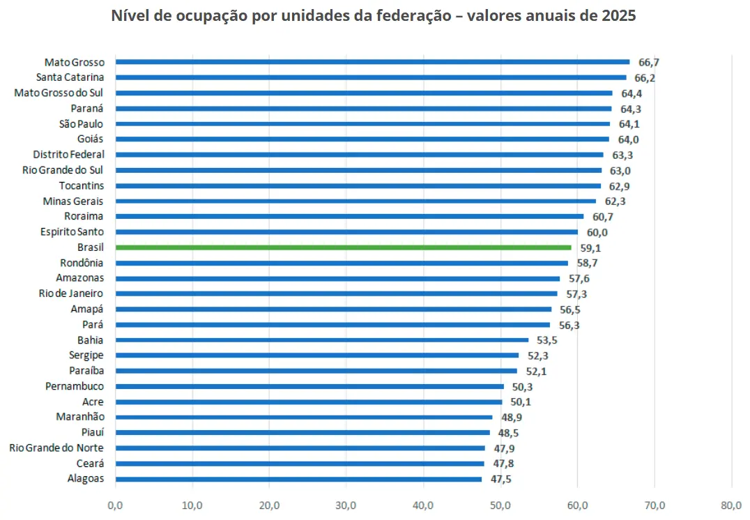 No ranking das unidades da federação, estados como Santa Catarina (65,9%), Mato Grosso (65,3%) e Goiás (63,5%) registraram os maiores níveis de ocupação. Já os menores índices foram observados no Maranhão (47,3%), Bahia (49,5%) e Alagoas (49,6%). O Acre aparece em posição intermediária inferior, mais próximo dos estados com menor participação da população no mercado de trabalho.