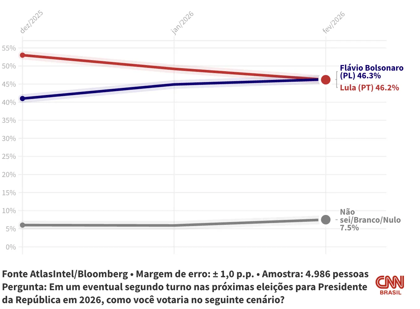 Flávio aparece com 46,3% — em janeiro, ele tinha 44,9%. Lula, por sua vez, tem 46,2%, antes tinha 49,2%.