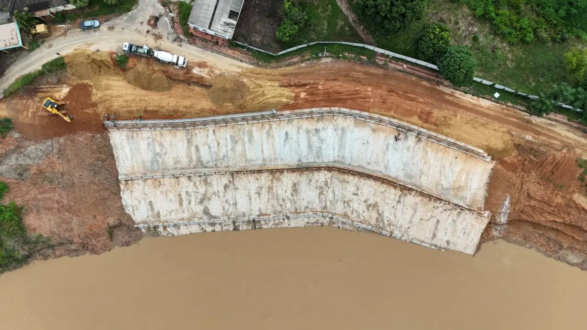A proteção da margem foi executada conforme o projeto aprovado, utilizando o sistema bolsacreto, técnica que consiste na aplicação de mantas preenchidas com concreto para reforço do barranco do rio, dentro das normas de engenharia aplicáveis a esse tipo de intervenção. O Deracre destaca que, nas margens dos rios da região, são comuns os chamados “terras caídas”, fenômeno natural que provoca erosão nos barrancos em razão da dinâmica das águas. A avaliação técnica considera esse contexto e o fato de que a obra ainda não foi concluída.