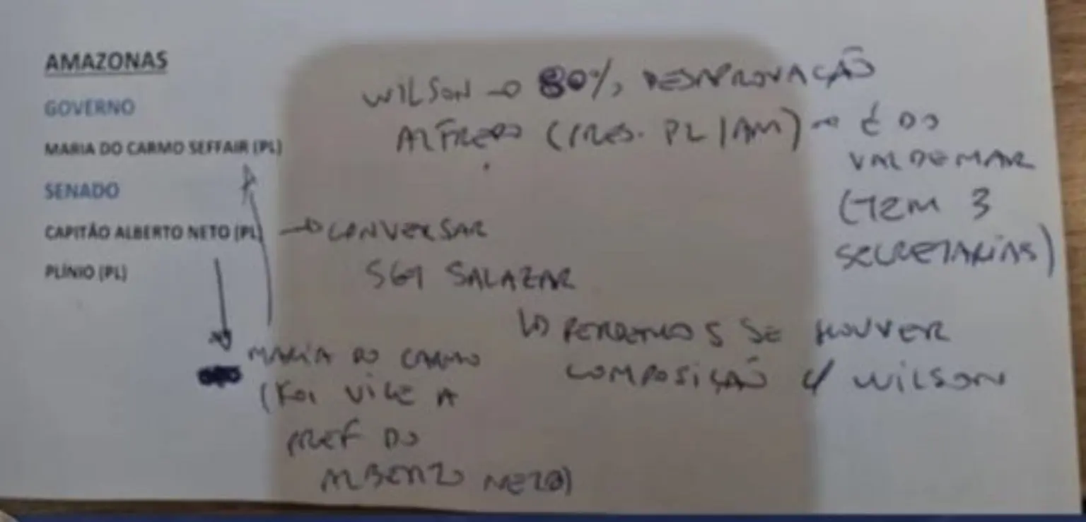 As anotações também registram que o ex-ministro Alfredo Nascimento, presidente do PL no Amazonas, ocupa três secretarias na atual gestão de Wilson Lima.