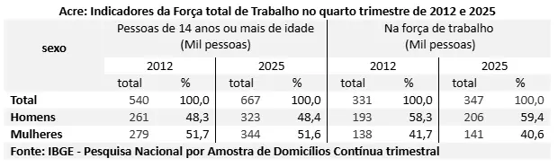 Os dados da PNAD Contínua, constante na tabela a seguir, mostram que as mulheres permanecem maioria na população de 14 anos ou mais no Acre: eram 51,7% em 2012 (279 mil) e 51,6% em 2025 (344 mil), acompanhando o crescimento da população em idade ativa, que passou de 540 mil para 667 mil pessoas no período. Ou seja, do ponto de vista demográfico, o estado mantém perfil majoritariamente feminino na população potencialmente apta ao trabalho.