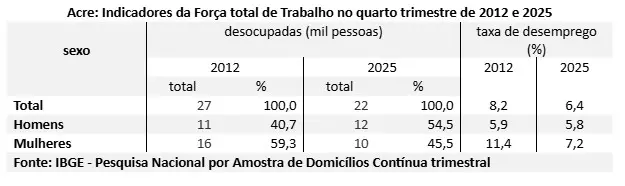 Embora ainda permaneça acima da masculina (5,8%), houve redução expressiva da desigualdade, indicando avanço importante na inserção feminina no mercado de trabalho acreano.