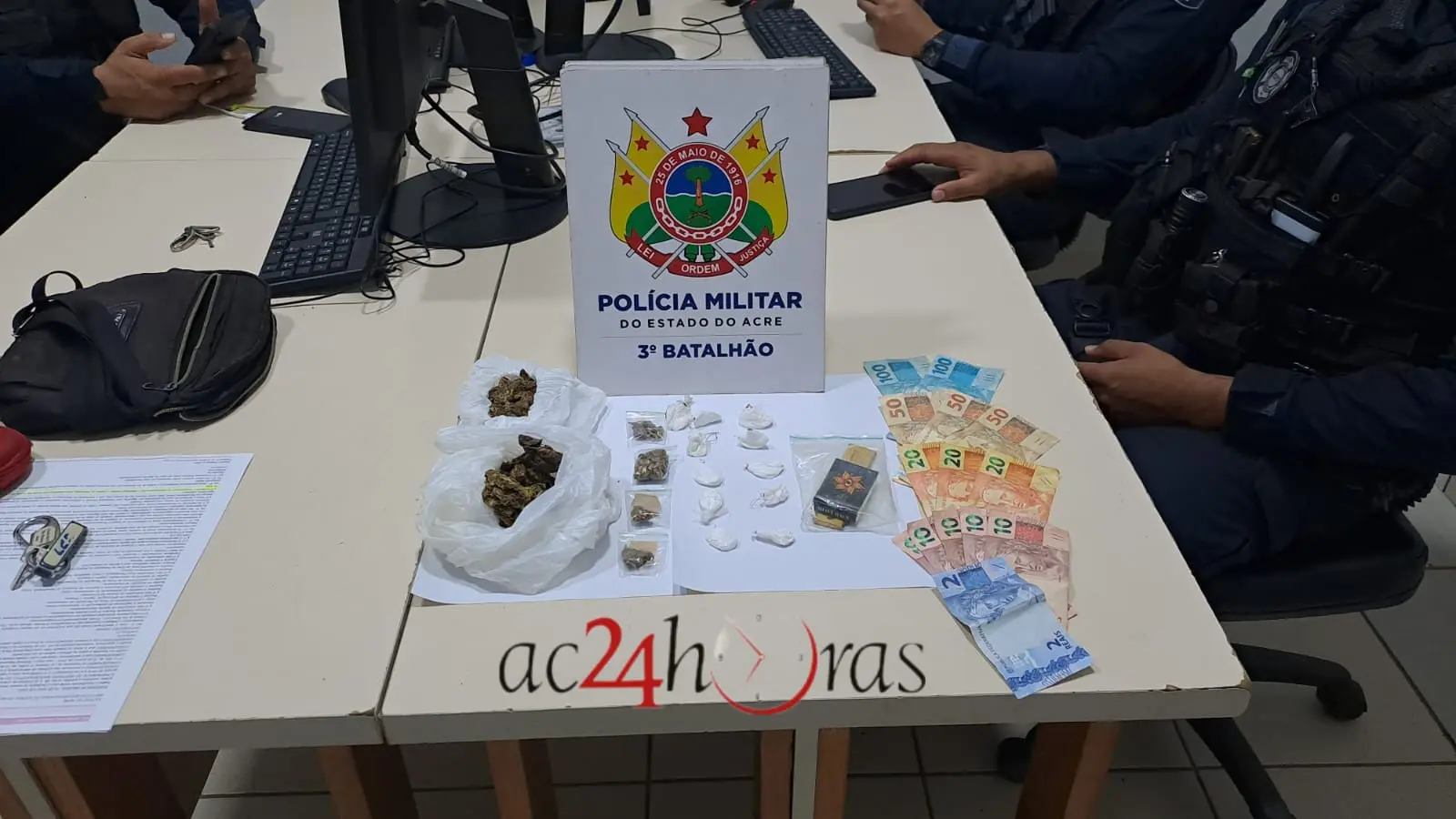 Foram apreendidos aproximadamente 86 gramas de maconha do tipo skunk e 6 gramas de pasta base de cocaína, além de dois telefones celulares e R$ 462 em dinheiro.