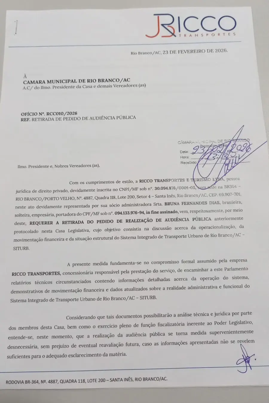 A empresa Ricco Transportes e Turismo Ltda. havia protocolado na Câmara Municipal de Rio Branco um ofício solicitando a retirada do pedido de realização de audiência pública que trataria sobre a operacionalização e a situação financeira do Sistema Integrado de Transporte Urbano de Rio Branco (SITURB).