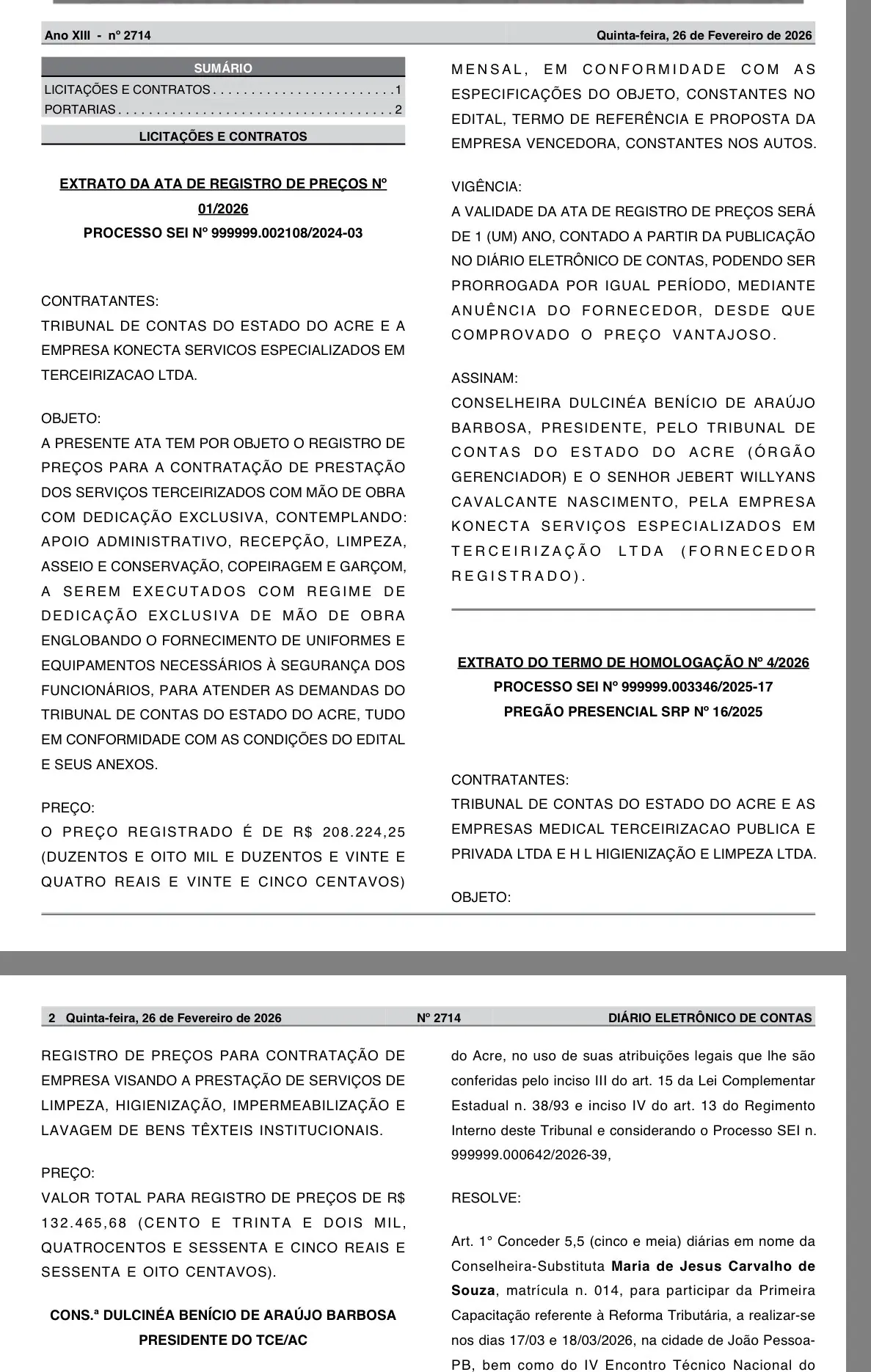 O Tribunal de Contas do Estado do Acre publicou, no Diário Eletrônico desta quinta-feira (26), dois atos administrativos relacionados à contratação de serviços terceirizados e ao registro de preços para higienização de bens institucionais.