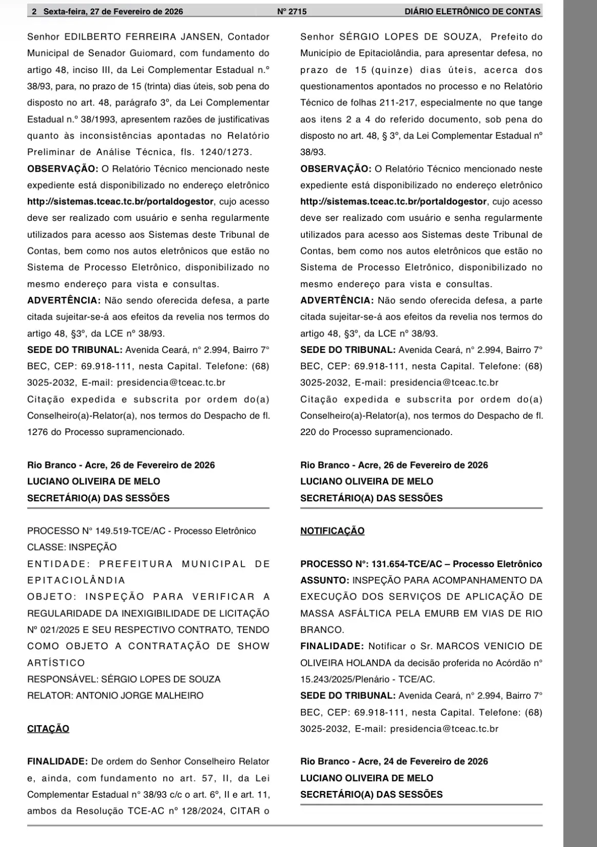 O Tribunal de Contas do Estado do Acre (TCE-AC) determinou a citação do prefeito de Epitaciolândia, Sérgio Lopes de Souza, para que apresente defesa no prazo de 15 dias úteis no processo que apura a regularidade da Inexigibilidade de Licitação nº 021/2025.