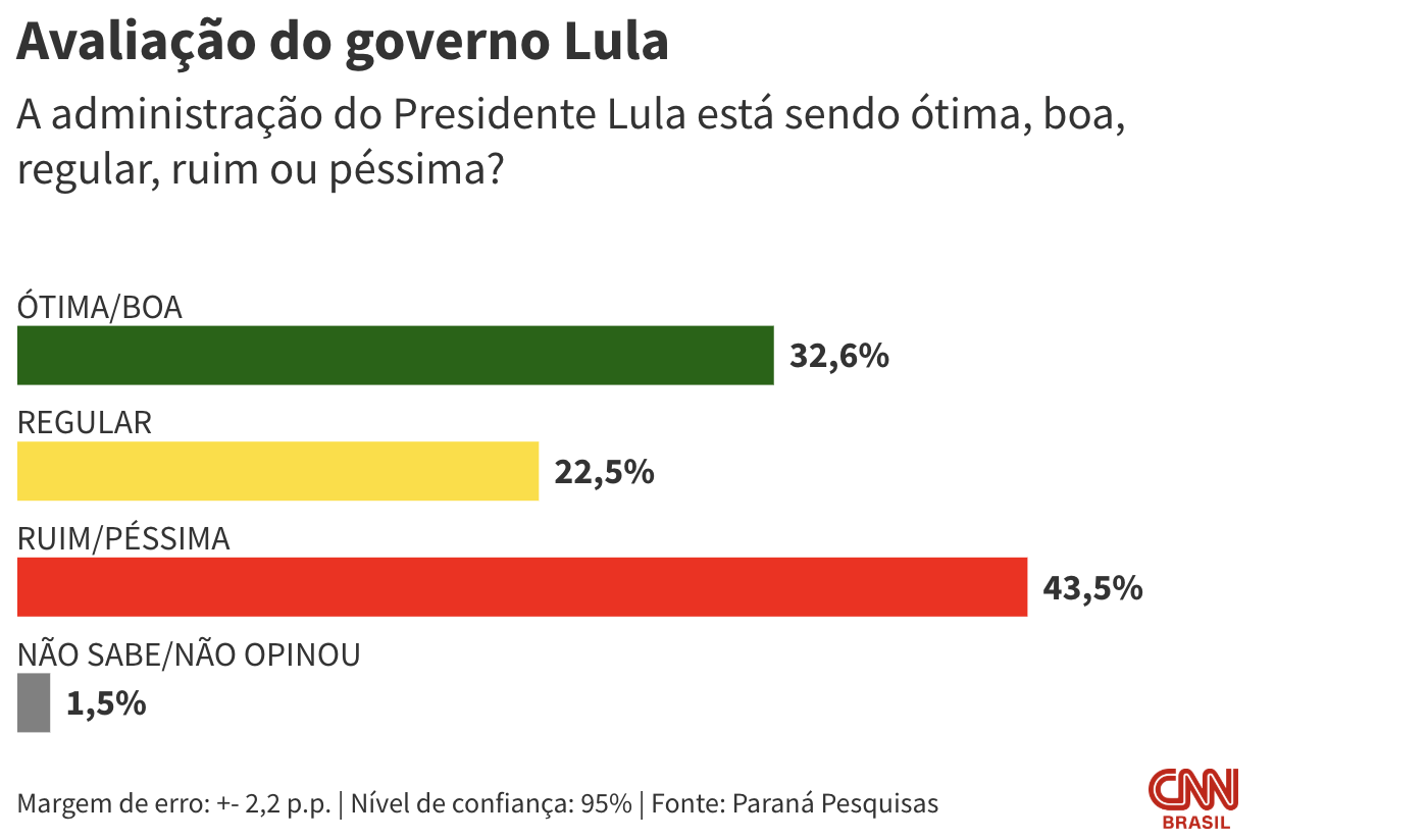 O trabalho do presidente Luiz Inácio Lula da Silva (PT) é avaliado negativamente por 43,5% e positivamente por outros 32,6%, segundo pesquisa do instituto Paraná Pesquisas divulgada nesta sexta-feira (27).