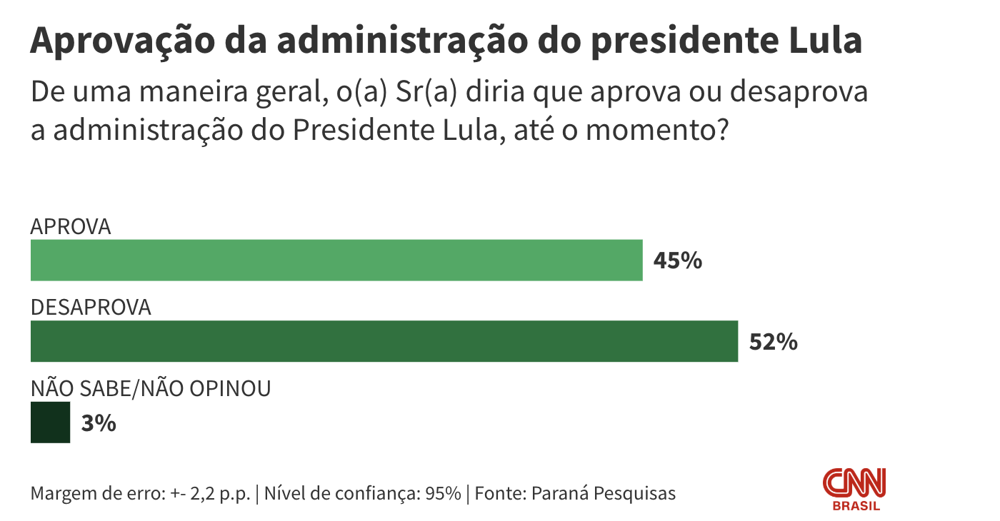 O instituto também questionou se os entrevistados aprovam ou desaprovam a gestão de Lula. O presidente é desaprovado por 52% dos entrevistados e aprovado por 45%. Outros 3% não souberam ou não opinaram.