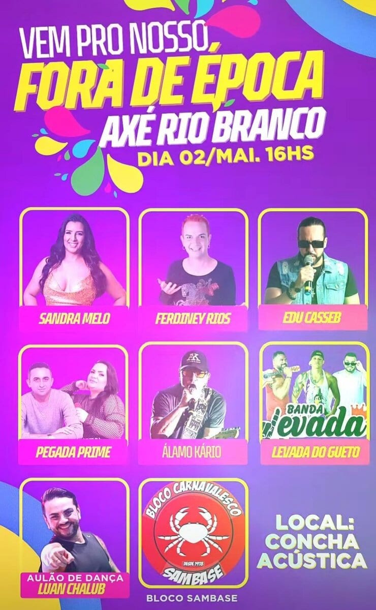O evento “Fora de Época Axé Rio Branco” será realizado no dia 2 de maio, a partir das 16h, na Concha Acústica, em Rio Branco. A programação reúne atrações musicais e apresentação de bloco carnavalesco.