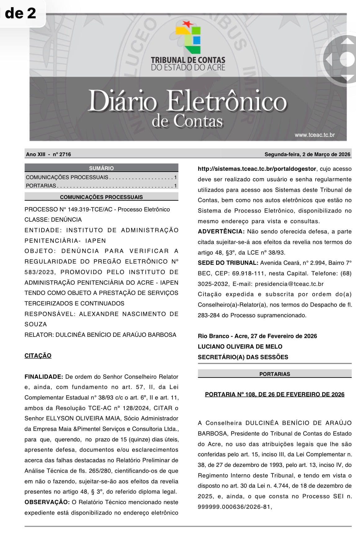 O Tribunal de Contas do Estado do Acre (TCE-AC) expediu citação no âmbito do Processo nº 149.319-TCE/AC, que trata de denúncia para apurar a regularidade do Pregão Eletrônico nº 583/2023, promovido pelo Instituto de Administração Penitenciária do Acre (Iapen). O certame teve como objeto a prestação de serviços terceirizados e continuados. O documento foi publicado no Diário Eletrônico desta segunda-feira, 2.
