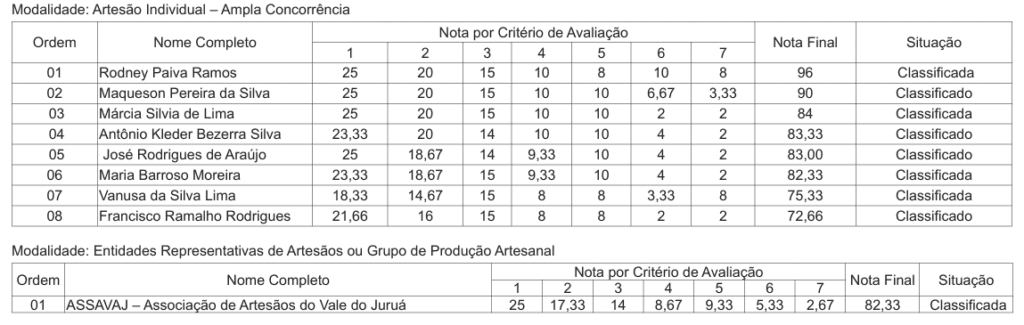 A lista provisória foi retificada e divulgada no Diário Oficial do Estado pela Secretaria de Estado de Turismo e Empreendedorismo (Sete), em parceria com a Coordenação Estadual do Programa do Artesanato Brasileiro (PAB).