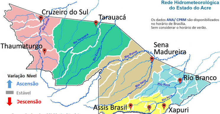 O monitoramento hidrometeorológico divulgado nesta quarta-feira (4) pela Secretaria de Estado do Meio Ambiente (Sema) aponta que a maior parte dos rios do Acre apresentou redução no nível nas últimas horas, com exceção dos municípios de Sena Madureira e Tarauacá, onde foi registrada elevação. Os dados consideram medições realizadas às 6h (horário local) nas réguas e plataformas da rede hidrometeorológica.