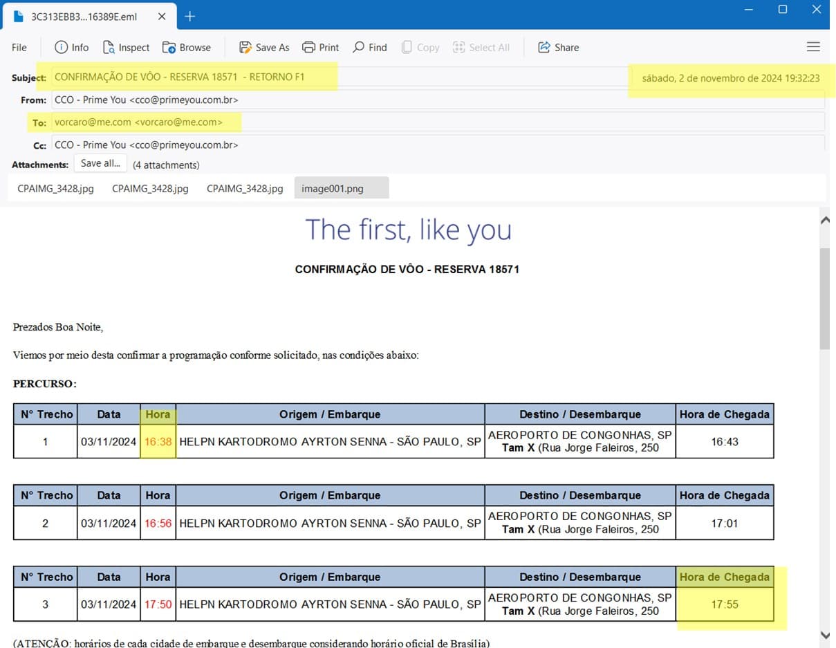 A mensagem com detalhes dos voos foi enviada pela Prime You ao e-mail pessoal de Vorcaro. O ex-banqueiro era sócio da empresa de táxi aéreo até setembro de 2025. A coluna teve acesso ao documento.