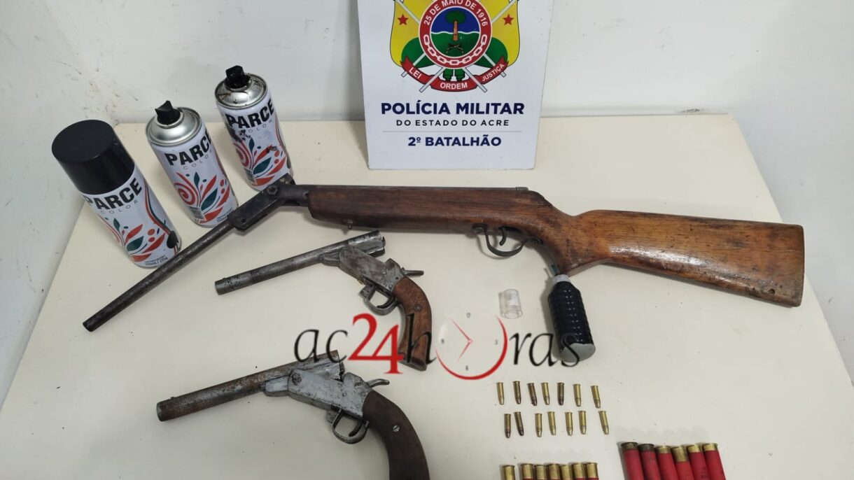 Policiais militares do Tático do 2º Batalhão apreenderam três armas de fogo, munições e uma granada de fabricação caseira durante uma ação de patrulhamento realizada na noite desta quarta-feira (5), na Vila Albert Sampaio, situada no Segundo Distrito de Rio Branco. O armamento foi localizado após indivíduos fugirem ao perceber a presença da guarnição.