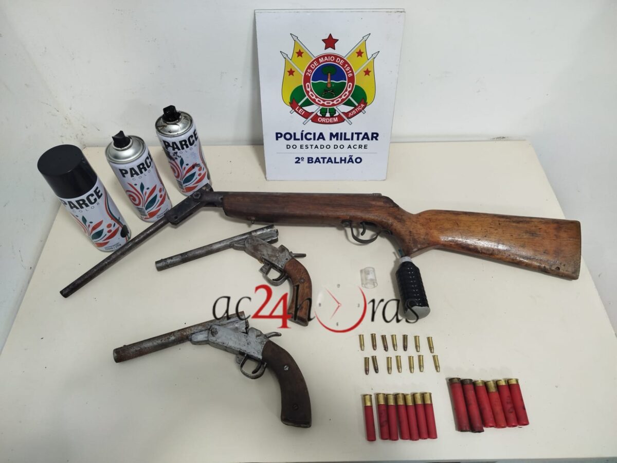 Policiais militares do Tático do 2º Batalhão apreenderam três armas de fogo, munições e uma granada de fabricação caseira durante uma ação de patrulhamento realizada na noite desta quarta-feira (5), na Vila Albert Sampaio, situada no Segundo Distrito de Rio Branco. O armamento foi localizado após indivíduos fugirem ao perceber a presença da guarnição.