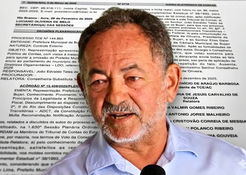 O Tribunal de Contas do Estado do Acre (TCE-AC) aplicou multa ao prefeito de Bujari, João Edvaldo Teles de Lima, o Padeiro, por descumprimento do prazo para envio do Projeto da Lei de Diretrizes Orçamentárias (LDO) de 2026 ao Legislativo municipal. A decisão consta no Diário Eletrônico desta quinta-feira, 5.