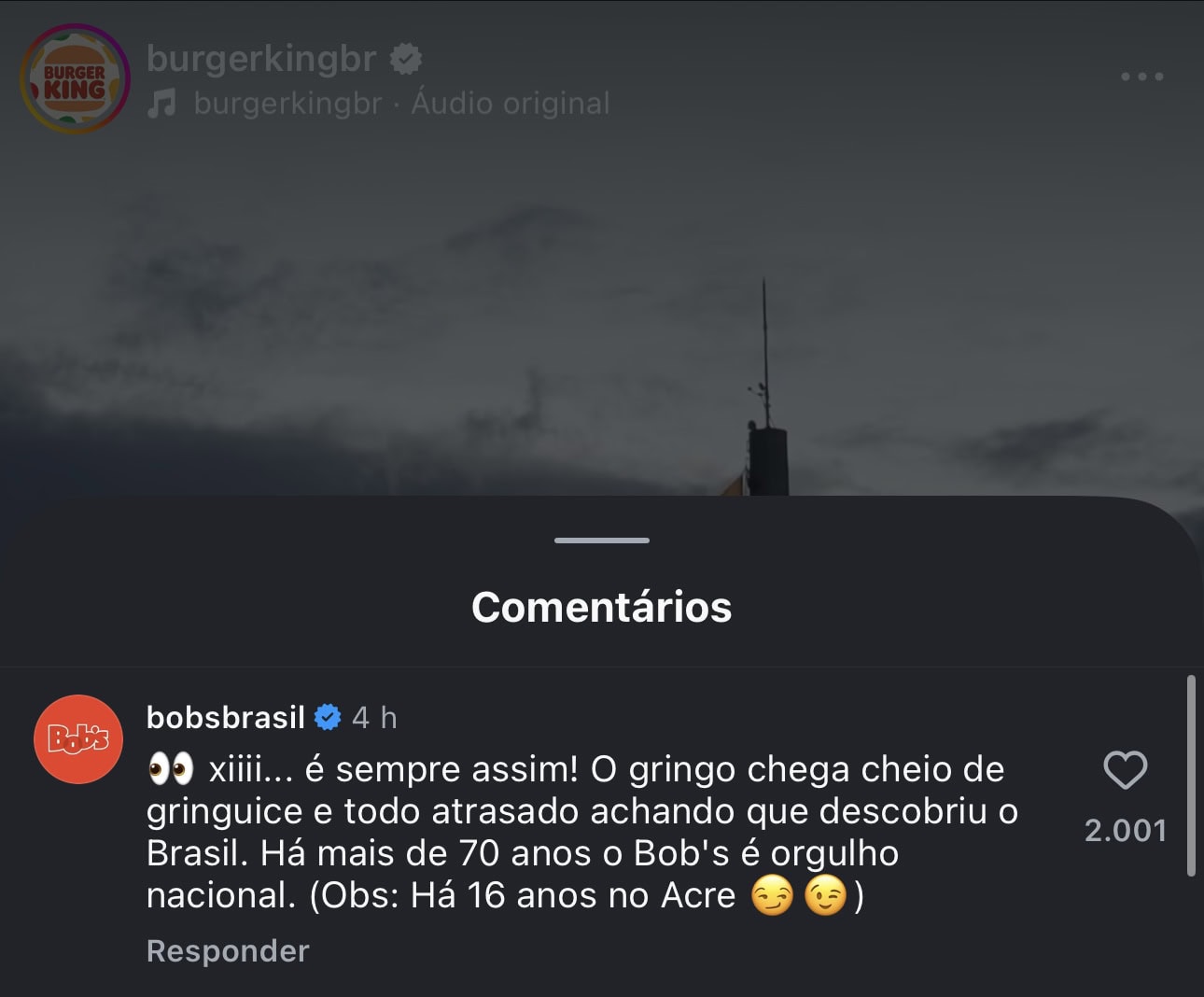 “É sempre assim! O gringo chega cheio de gringuice e todo atrasado achando que descobriu o Brasil. Há mais de 70 anos o Bob’s é orgulho nacional. (Obs: Há 16 anos no Acre)”, escreveu a empresa em comentário.
