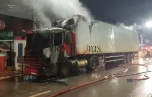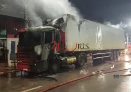 A cabine e parte do baú de uma carreta modelo Scania, de cor vermelha, pegaram fogo na noite desta terça-feira (30), após o motorista parar