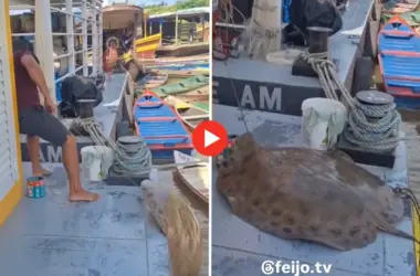 Uma cena chamou a atenção dos moradores de Feijó, no interior do Acre, nesta semana. Um pescador local fisgou uma arraia de aproximadamente 80 quilos