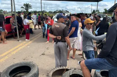 Moradores do bairro Castelo Branco e adjacências que interditaram a rua Rio Grande do Sul, em Rio Branco, protestando contra a transferência do Centro de