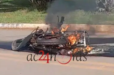 Um acidente de trânsito envolvendo um carro e uma motocicleta deixou uma pessoa com escoriações e resultou na destruição total da moto pelo fogo, na
